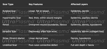 Scarring, a complex biological response to dermal injury, manifests in various forms including surgical, hypertrophic, keloid, atrophic, stretch marks (striae), and umbilical scars. Traditional treatments often fall short due to the variability in scar biology and patient response. UltraPlasma™, a next-generation dermatological technology integrating arc, argon, and helium plasma modalities, offers a multi-depth, multi-function strategy. This article explores the anatomical, biological, and engineering principles behind scar remediation using UltraPlasma™, including the effects on skin layers, reactive species interactions, and clinical applications.